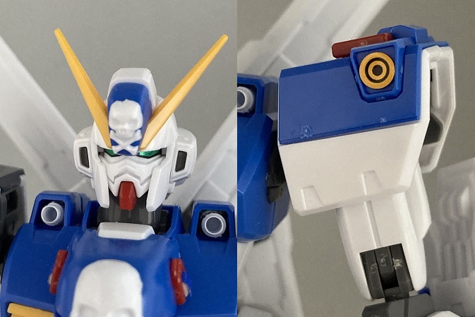 パーツによる分割で色分けは大部分が再現されていますが、顔は縦に赤いラインが入っていないので若干迫力に欠けます。また、左肩の部分は青と白の境界に赤いラインが入っていません。