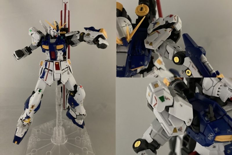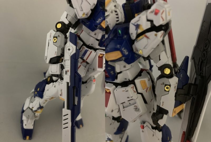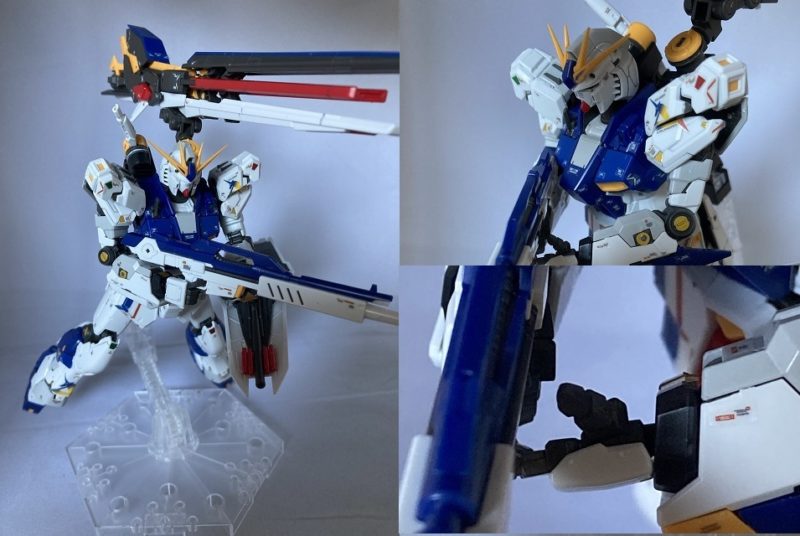 肩アーマーの真ん中あたりが分割されてるので腕を前面に出すとき、肩アーマーと干渉しない。平手パーツはビームライフルに添えることでポージングがきまる!