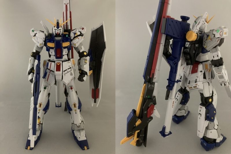 武器を装備させた立ち姿、カッコいい。ハイパーバズーカはバックパックにマウントすることができる。ライフルまたはバズーカはハンドパーツを固定させるので保持力に問題なし。但し、右手パーツしかないため、バズーカとライフルの両手持ちはできない。