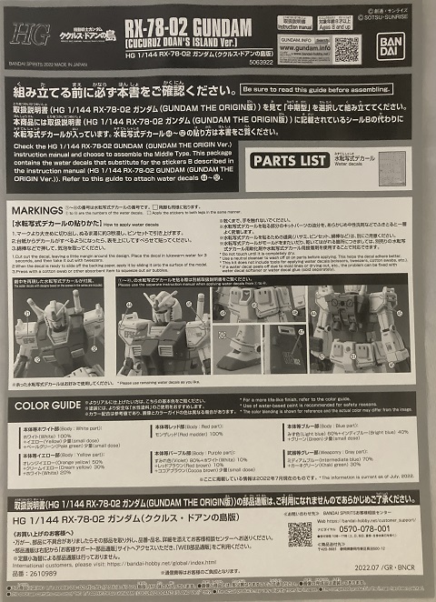 ククルスドアンの島版ガンダム用の説明書として1ページの説明書が追加で付属していた。主にデカール貼付場所の説明書。そしてククルスドアン版は中期型を選択するように書かれていた。