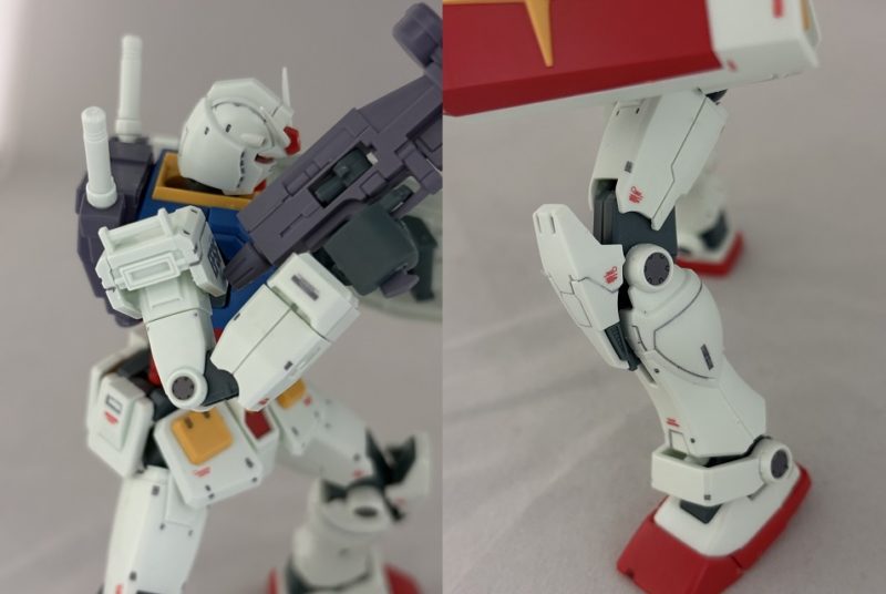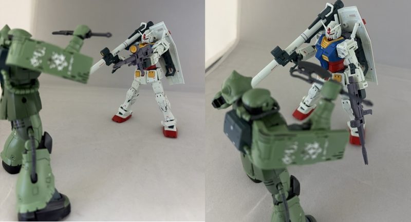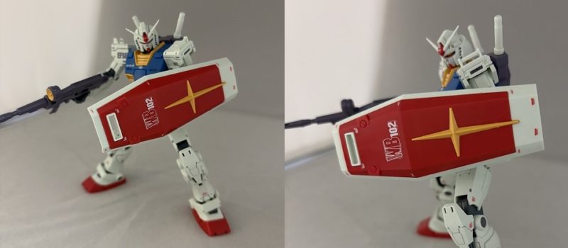 後ろにシールドをマウントしている状態でバズーカに付け替える。構えるポージングをするとシールドと干渉するのでシールドはマウントしない方がいいかもしれない。キットの個体差かもしれないがバズーカの先端の砲身部分がポロリしやすく、よく外れる。
