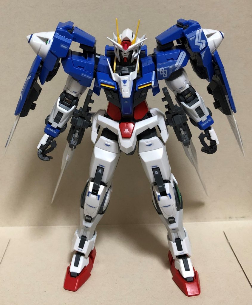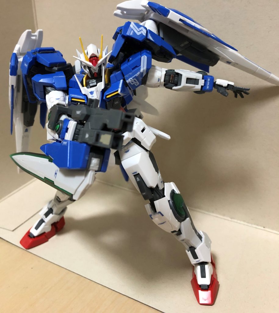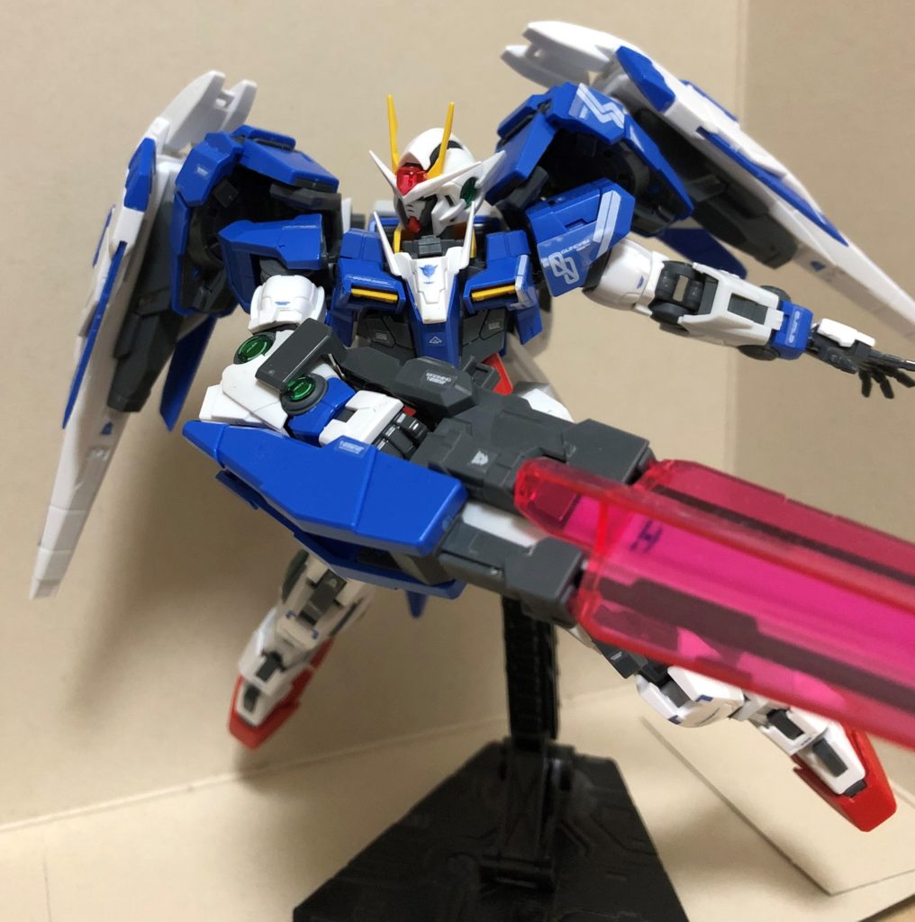 劇中では主人公機。だけど、近接武器が主体であまり遠距離武器のイメージがない。今回のRGプラモデルは、ダブルオーにダブルオーライザーが付属していて、もちろん合体出来て付属武器は一通り揃っているのがポイント。