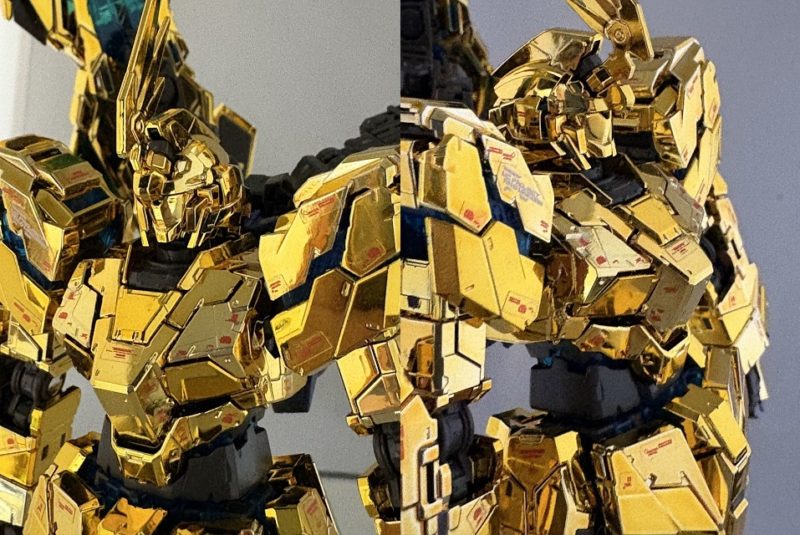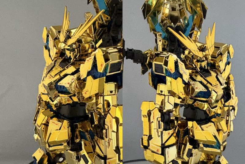 上半身アップ。画像では分かりにくいがメッキパーツが濃いメッキと薄いメッキに分かれており、装甲ごとに微妙に異なっており、RGはスゴイと思わせてくれる。
