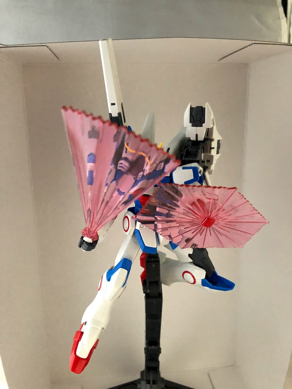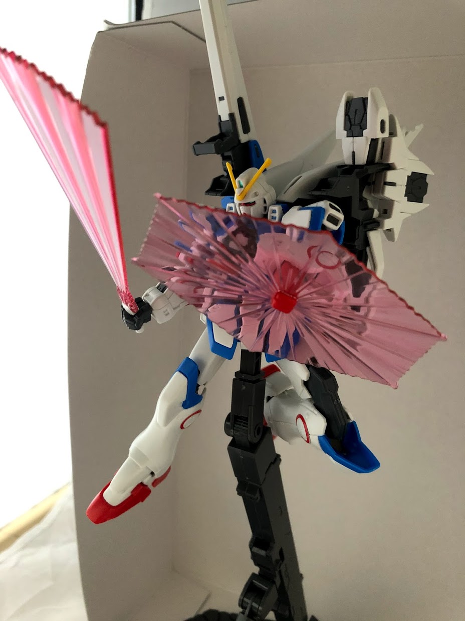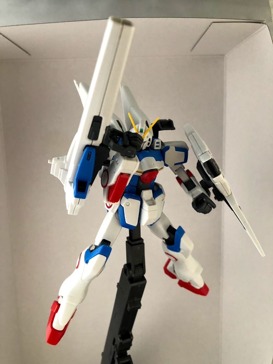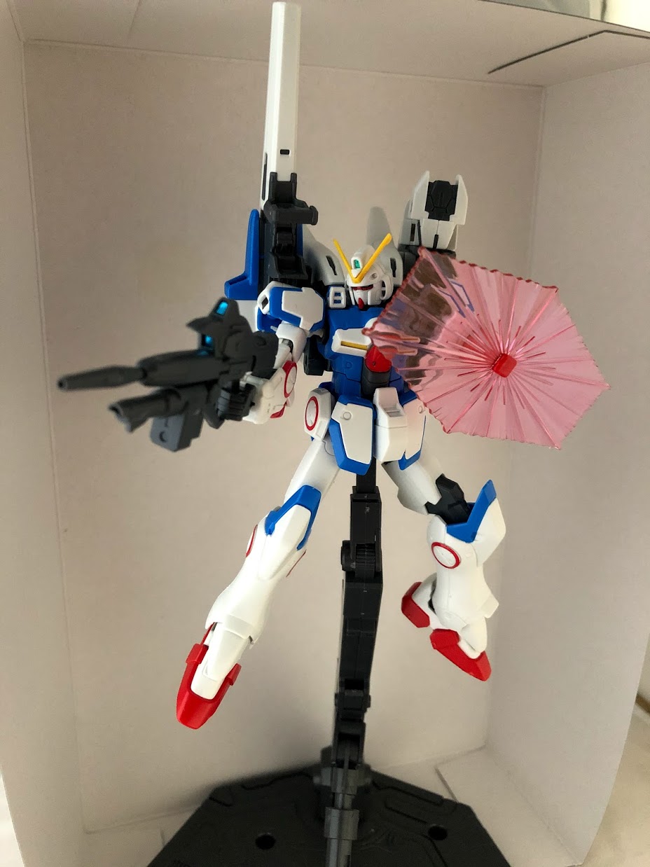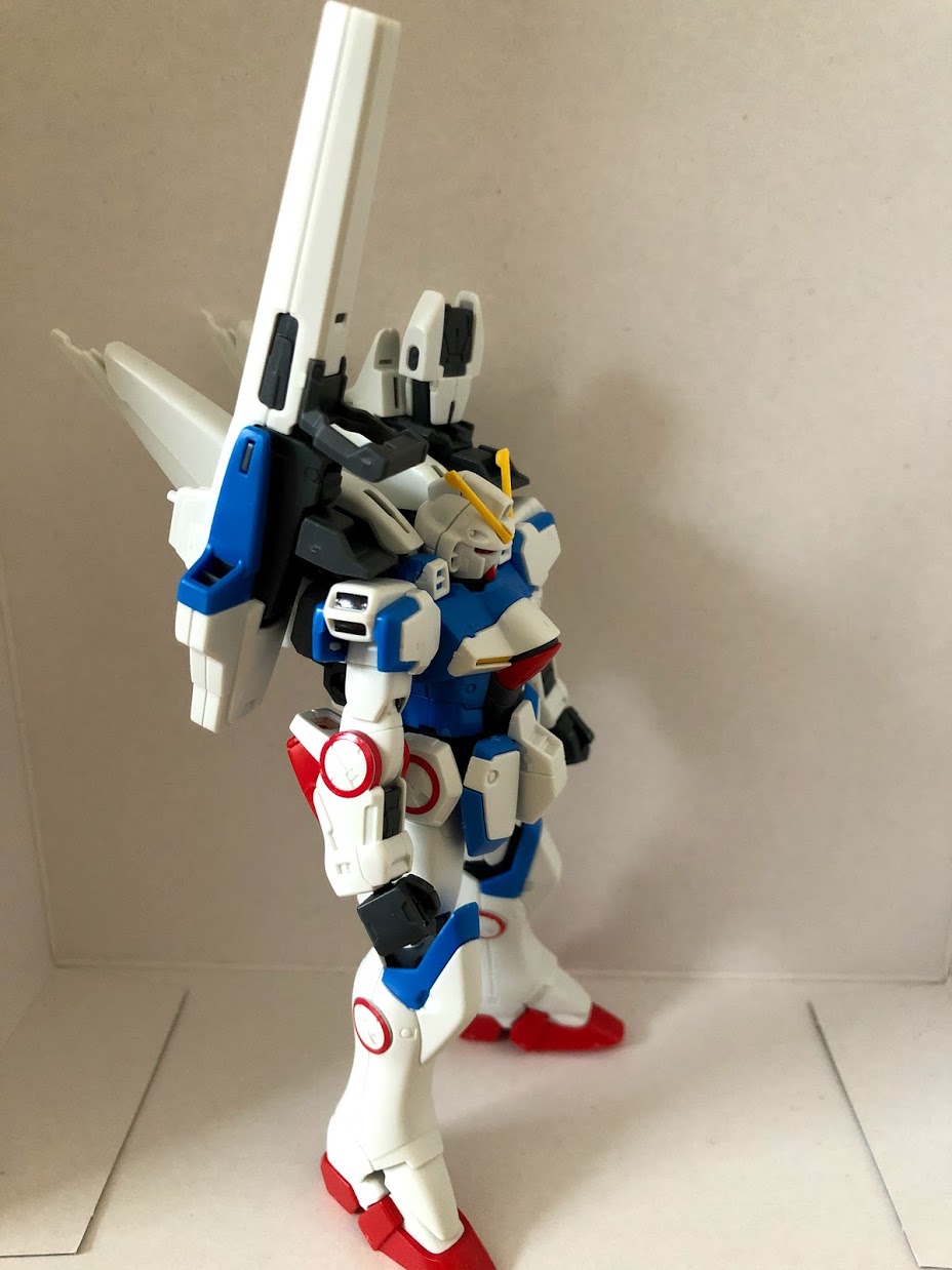 ビームサーベルとビームライフルとビームシールドをそれぞれ装備させてポージングさせてみました。難点としては、腰の部分の可動域が干渉しあって、あまり動かせないところです。この部分が惜しいところです。