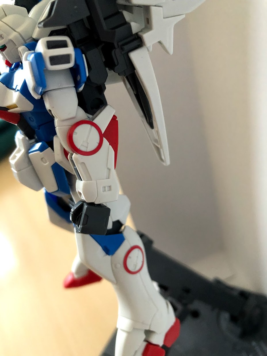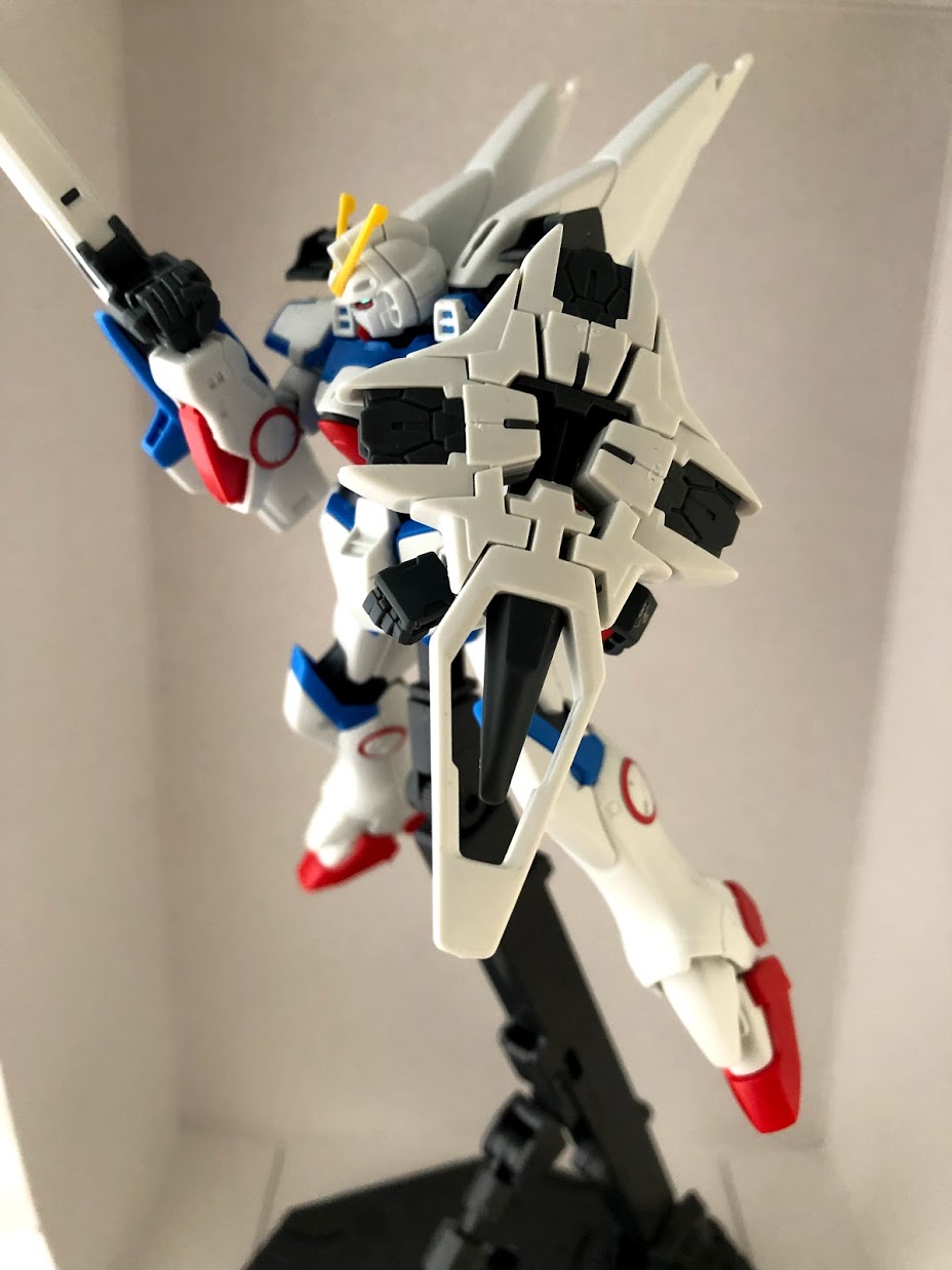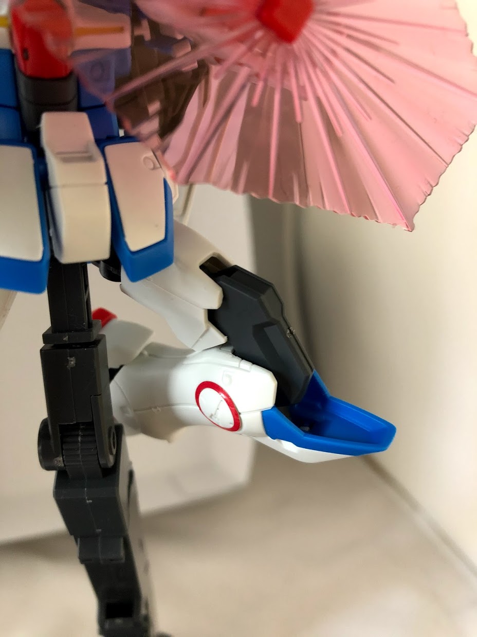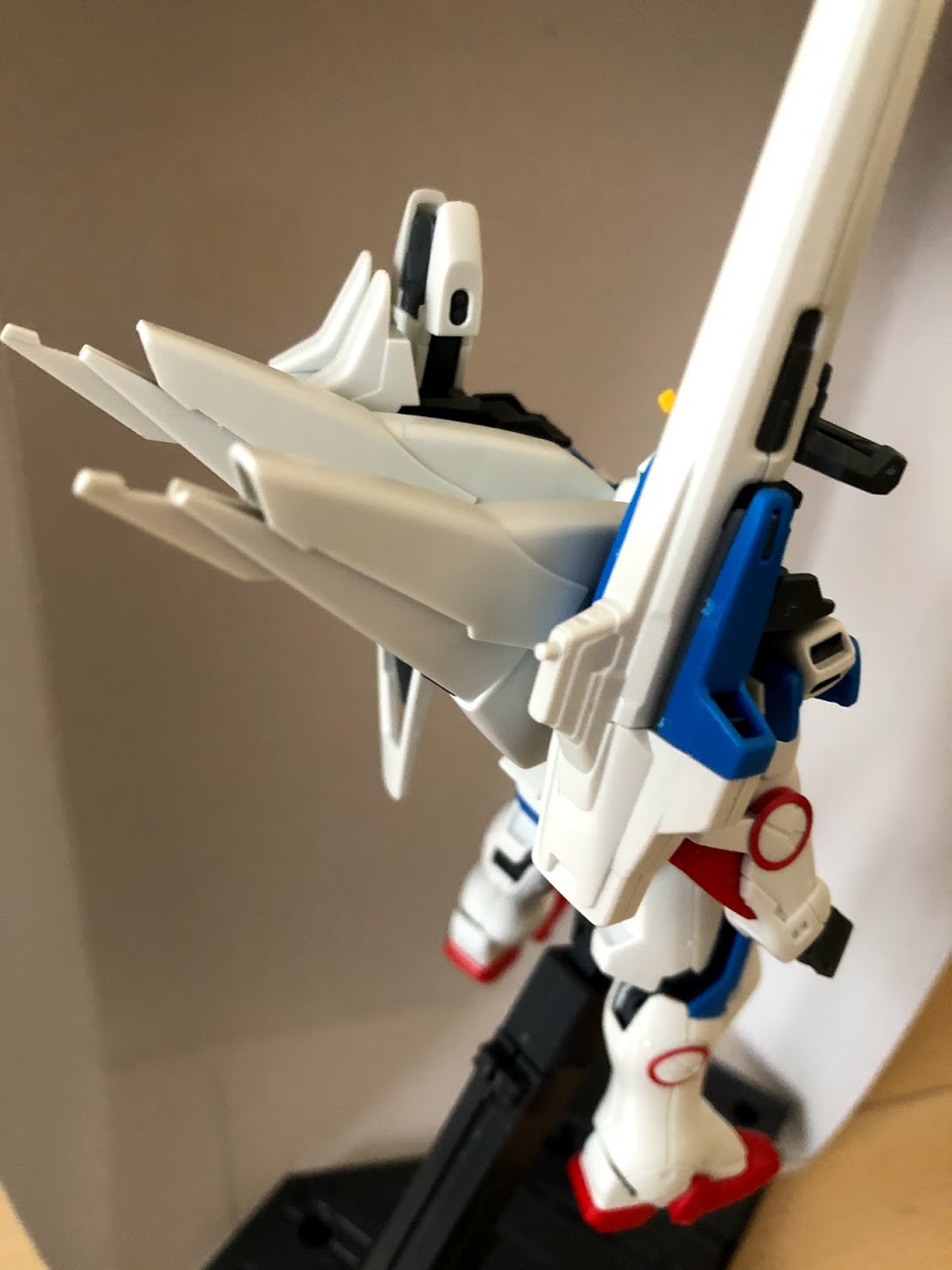 リア部分。ミノフスキードライブの部分は写真のように稼働します。この箇所に「光の翼」エフェクトパーツがあったら、いいのですが、残念ながら本キットには付いていません。