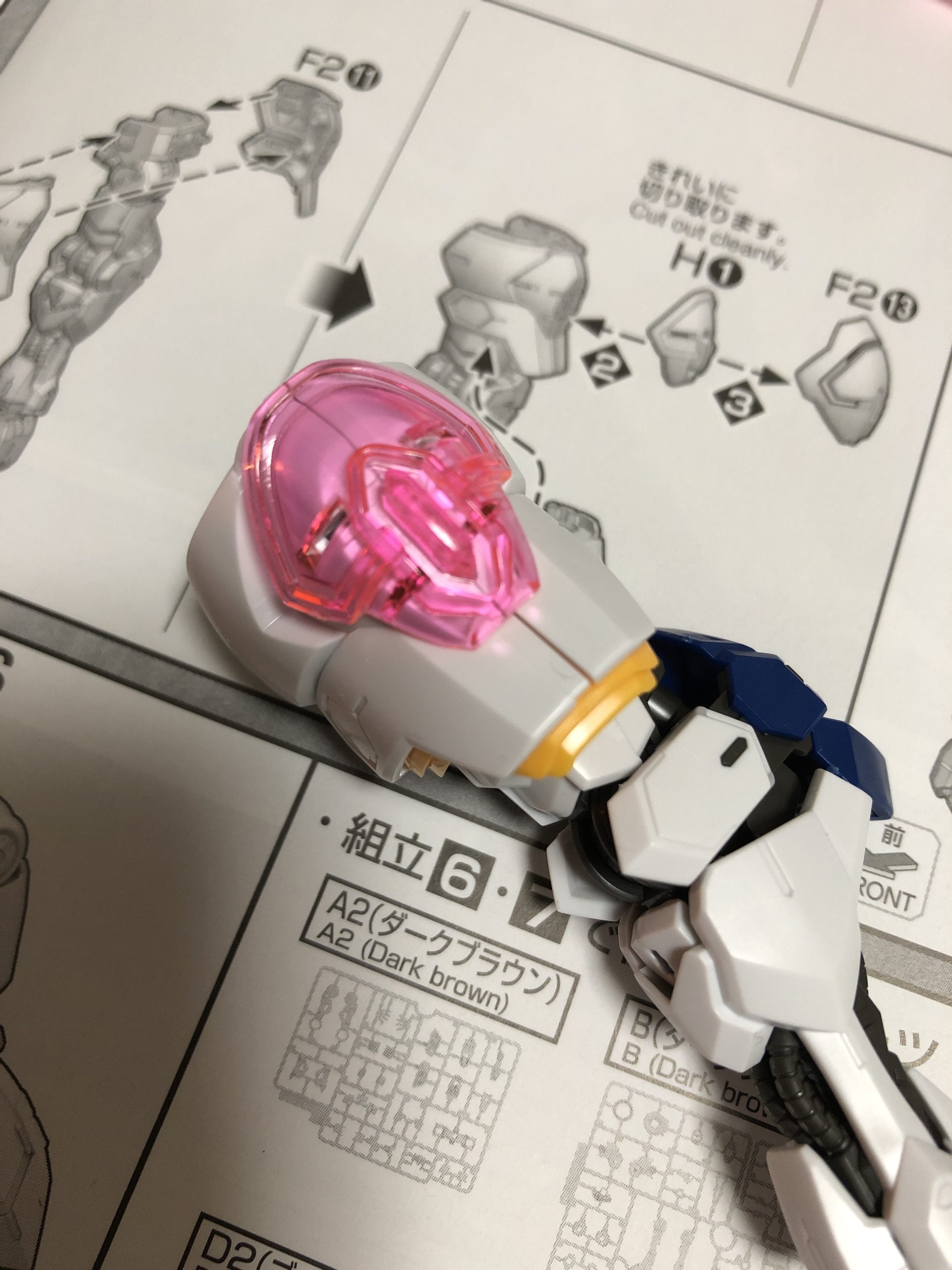 肩パーツと膝パーツの外装にピンクのクリアパーツが組み込まれており、いいアクセントになっています。