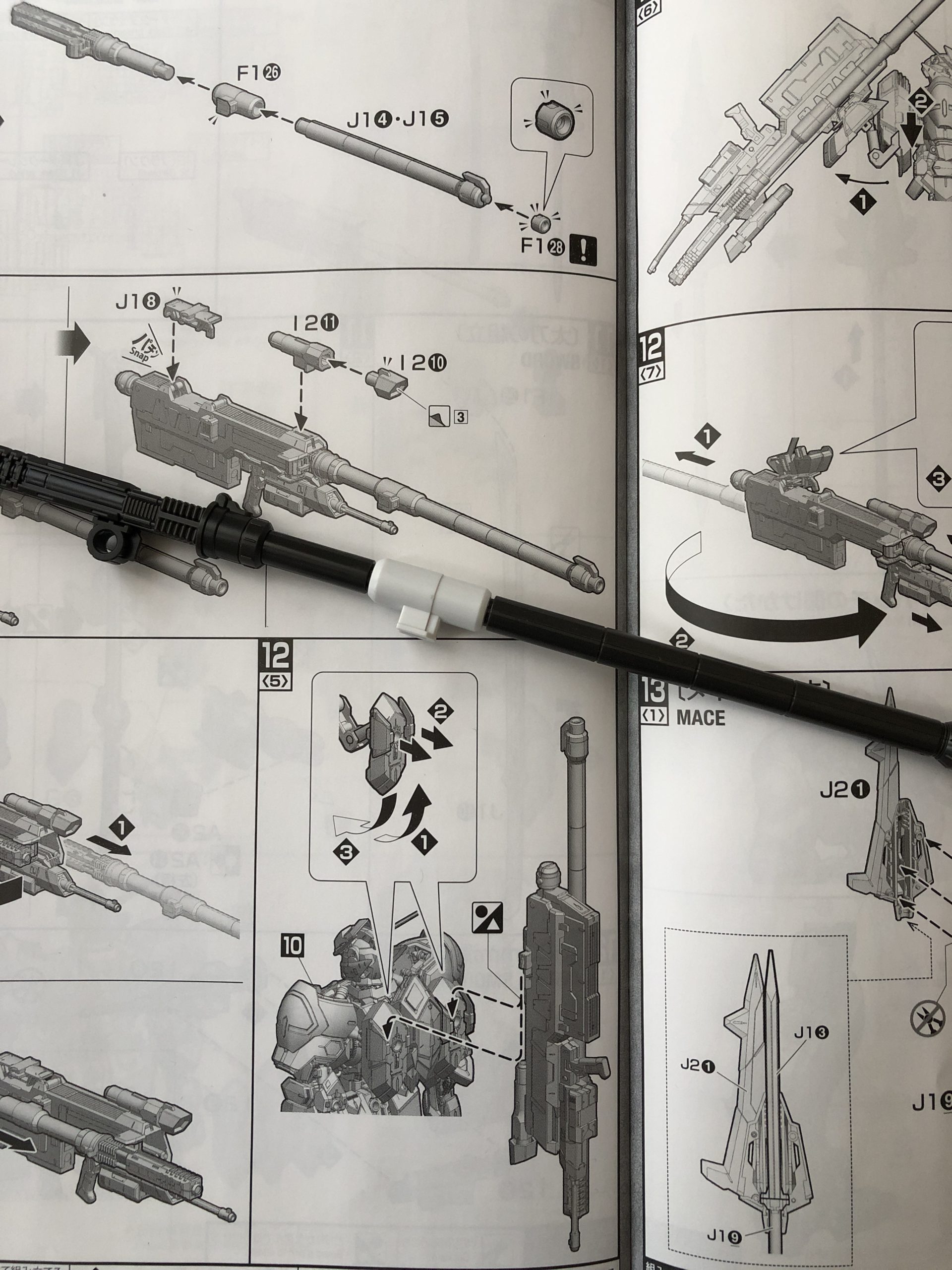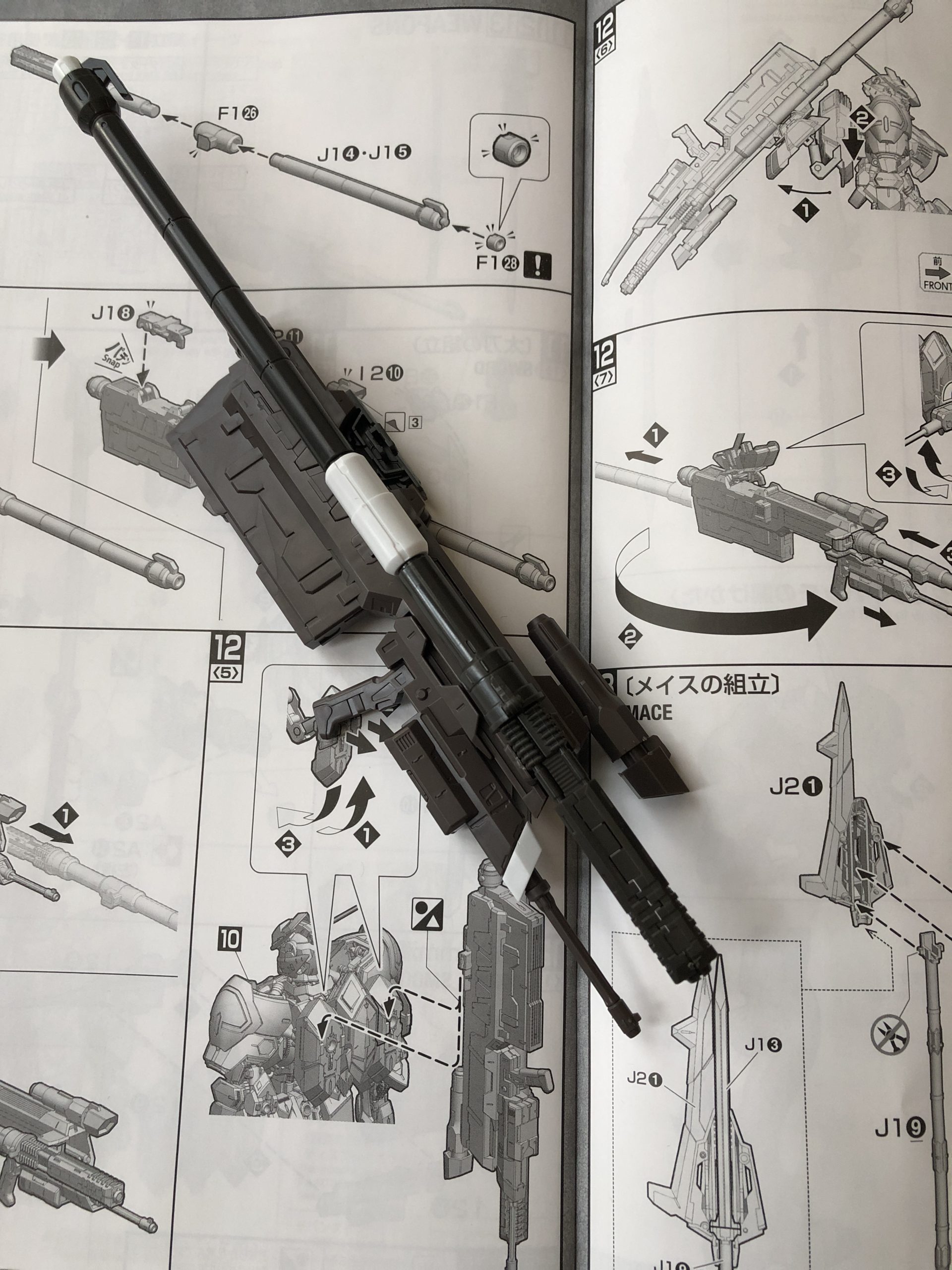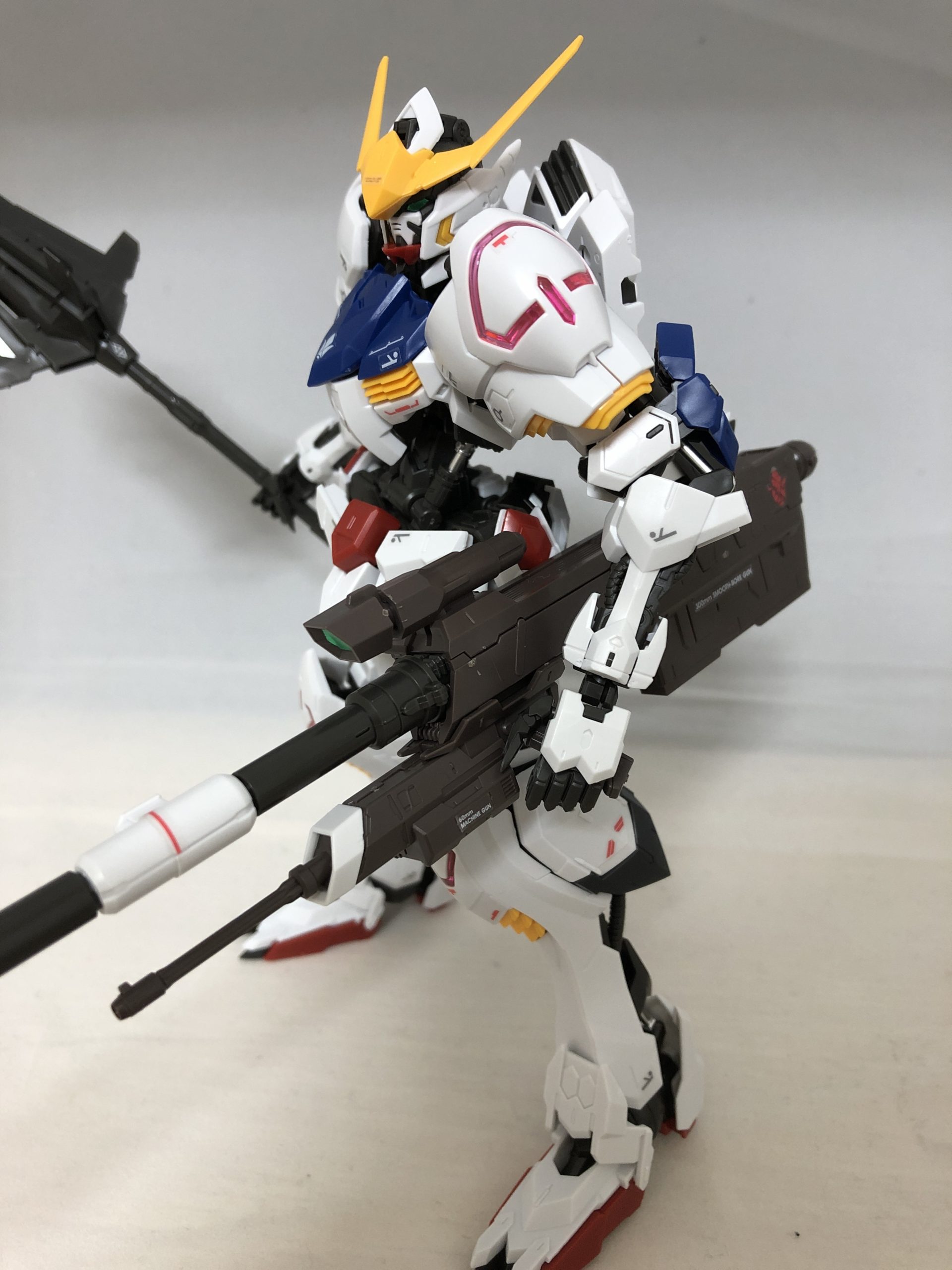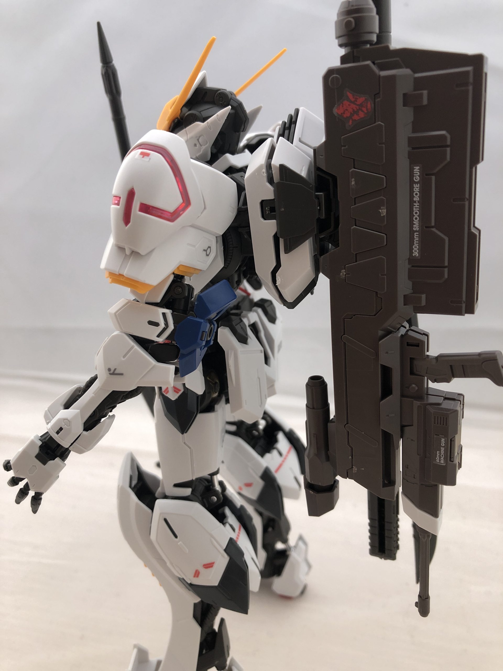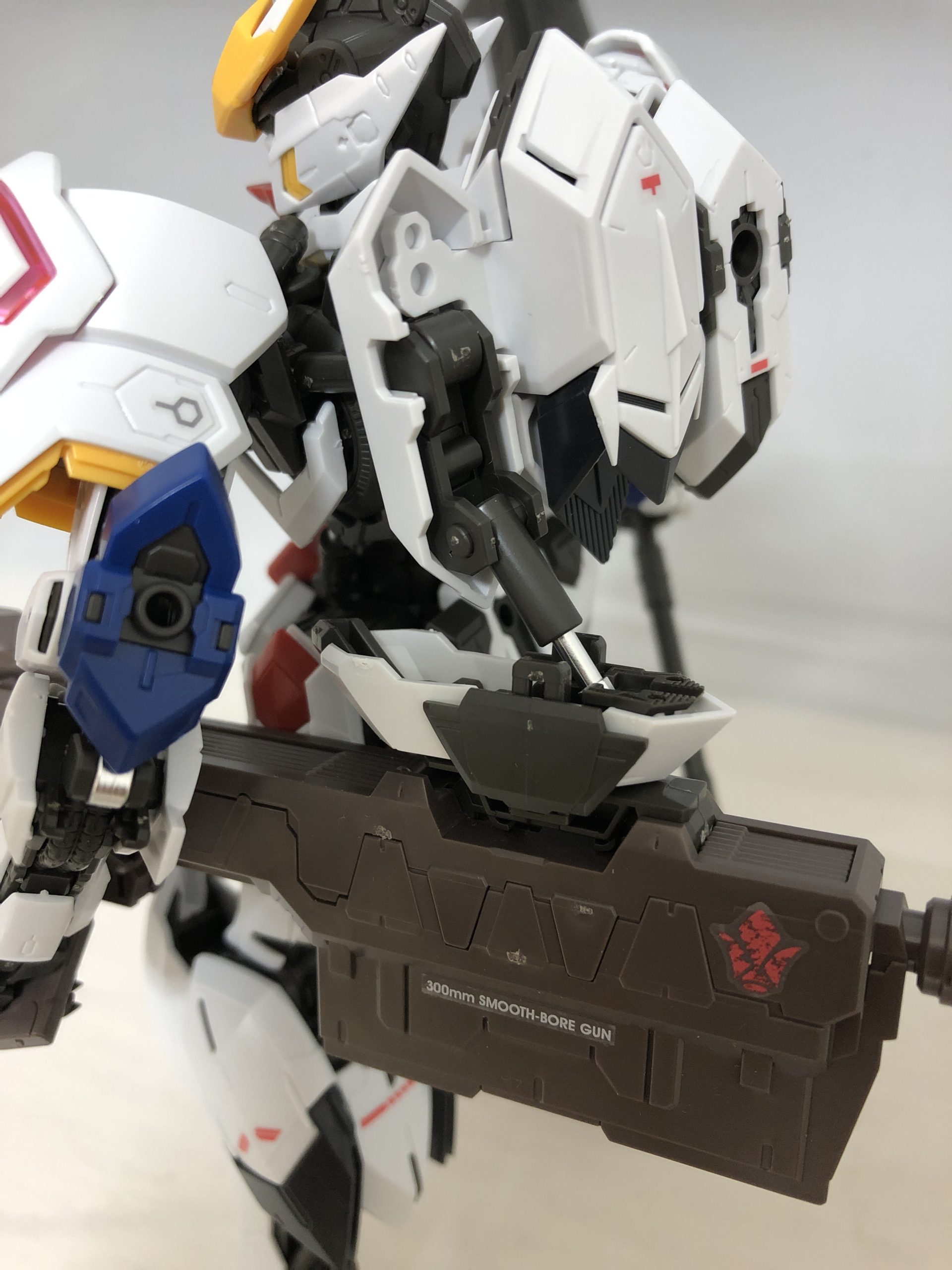 300mm滑腔砲は砲身を折り曲げて、バルバトスのパックパックに取り付けて収納することができます。砲身が長すぎて気を付けて扱わないと破損が怖いです。